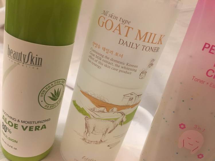 Yes To Micellar Cleansing Water / Esfolio Egg cleansing foam / Esfolio Goat Milk Daily Toner / beautySkin Cosmetics Emulsion Cream / JJ Young Pore Perfecting Multi-Cream / Frudia Serum / Derma-e Even Tone Brightening Night Cream / Revive Face Sheet Masks