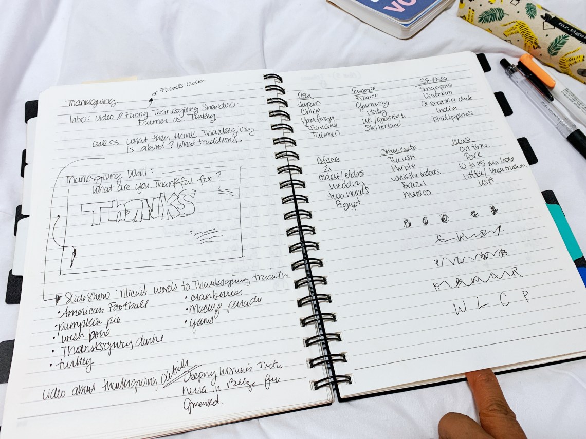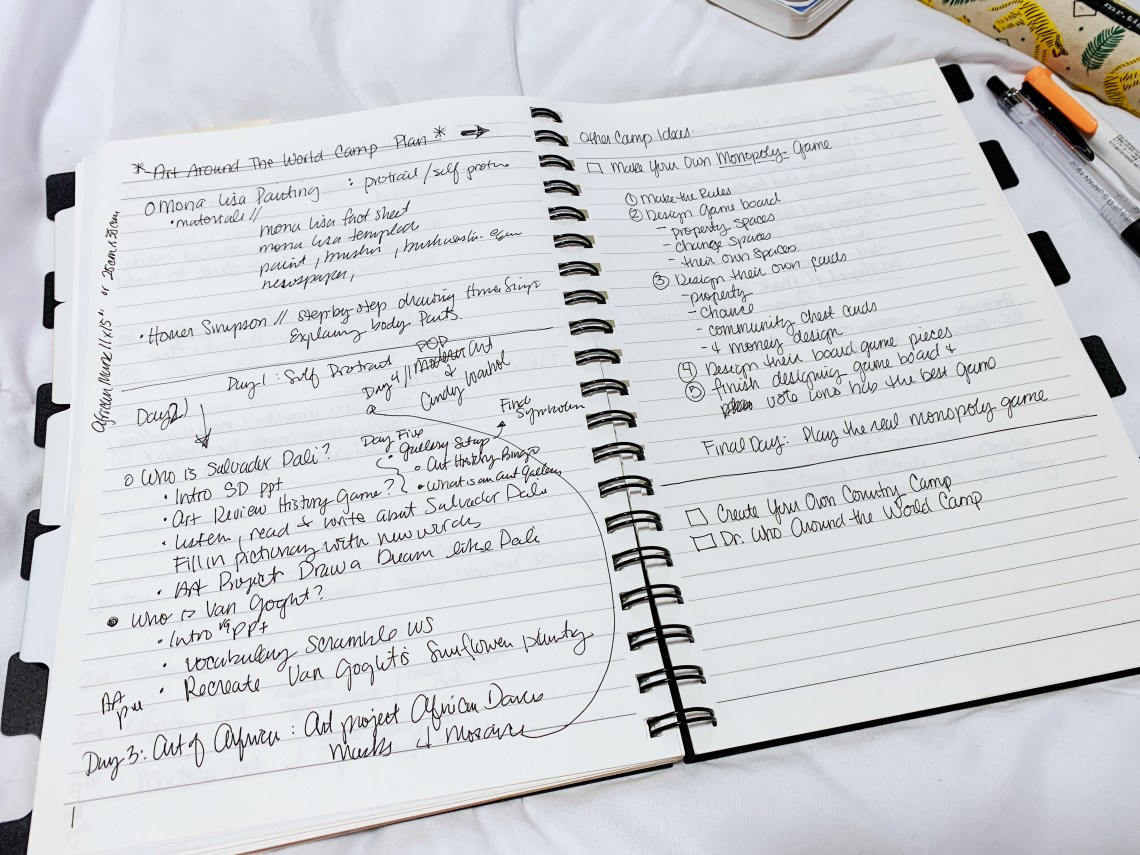 classroom. My detailed lesson plans are on my Google Docs, but things like keeping a schedule, notes for future lesson plans or ideas for summer camp, I write down in the notebook.